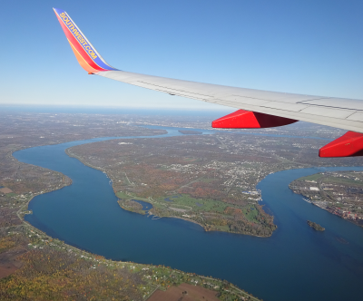 | Flying Southwest Airlines into Buffalo. On left is Canada, right is USA, at bottom is Lake Erie. In middle is Grand Island. The two rivers merge at top of picture to plunge over Niagara Falls. |